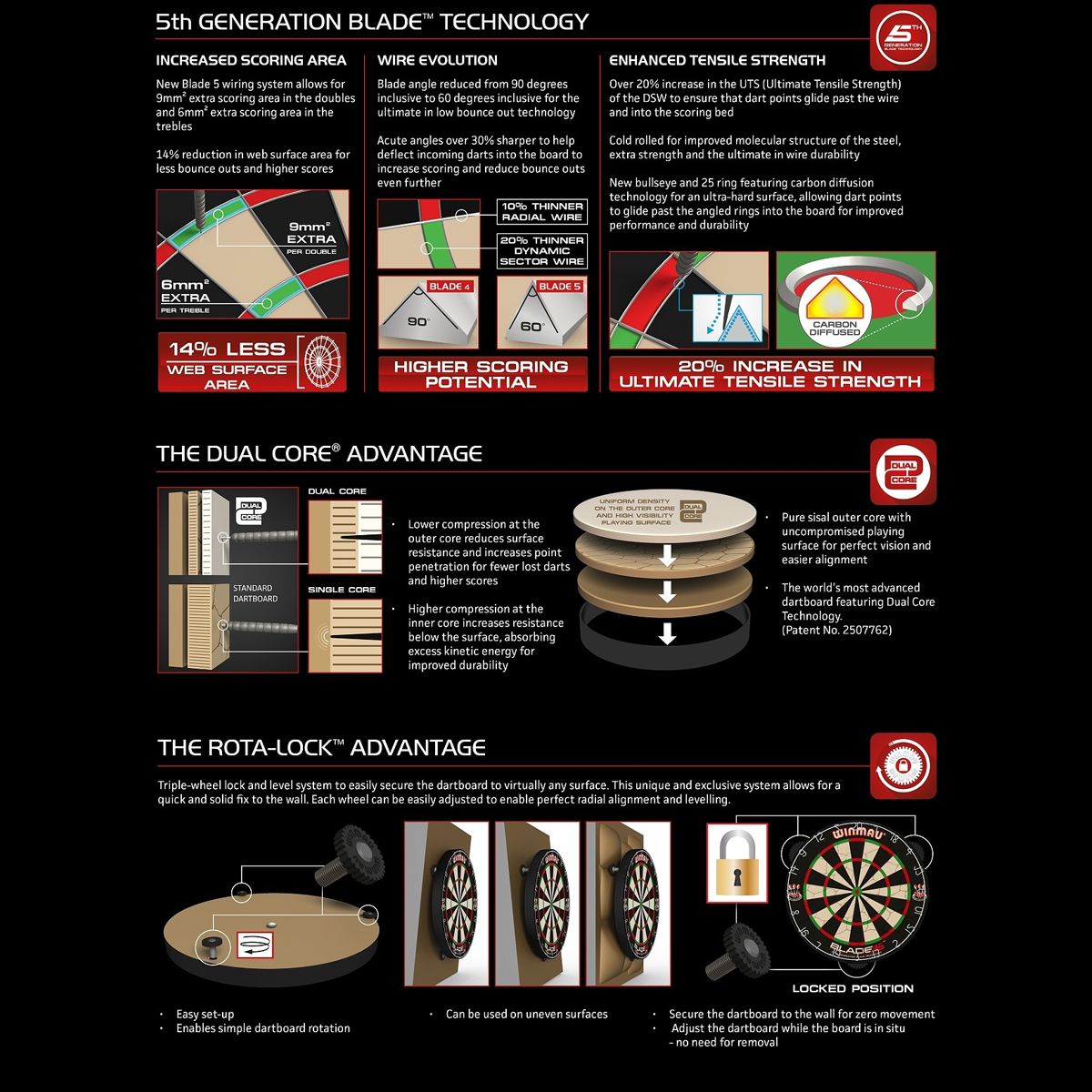 Die noch dünnere Verdrahtung bzw. der von 90 Grad Winkel auf 60 Grad reduzierte, spitze Winkel des Drahtes sorgt dadurch für eine rund 9 mm² größere Score-Fläche auf den Doubles und eine 6 mm² größere Trefferfläche der Triples-Felder!